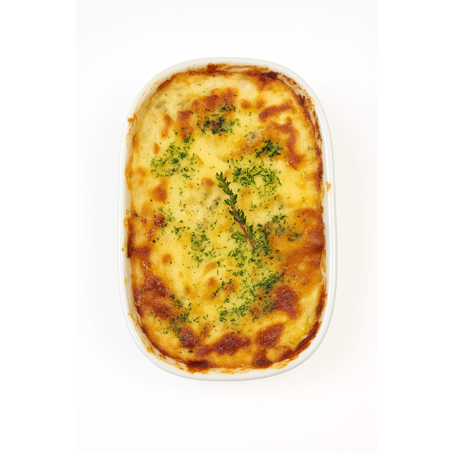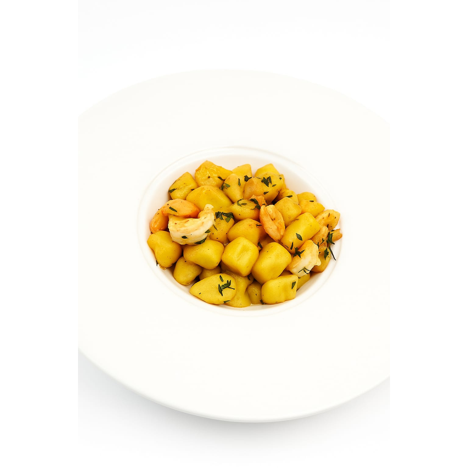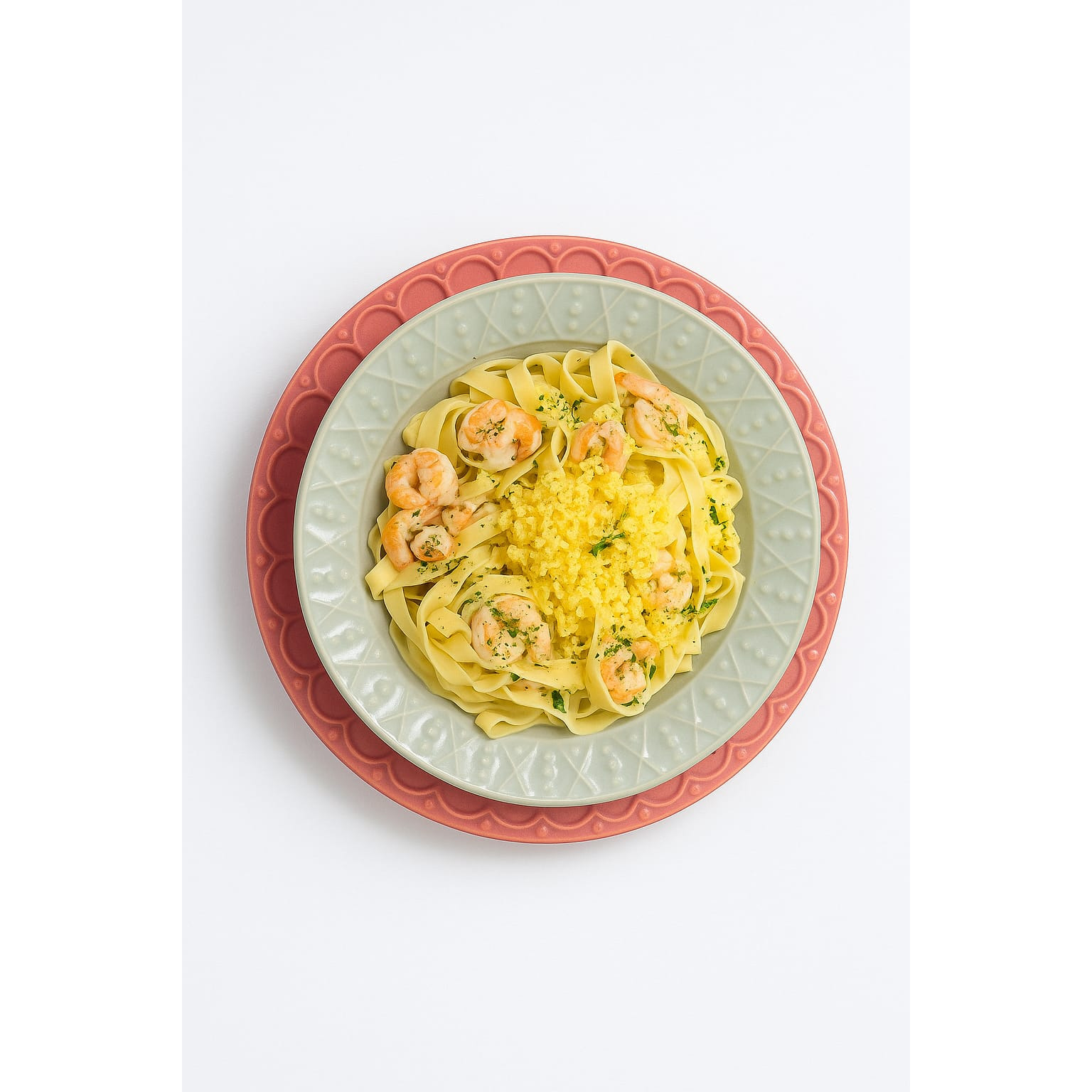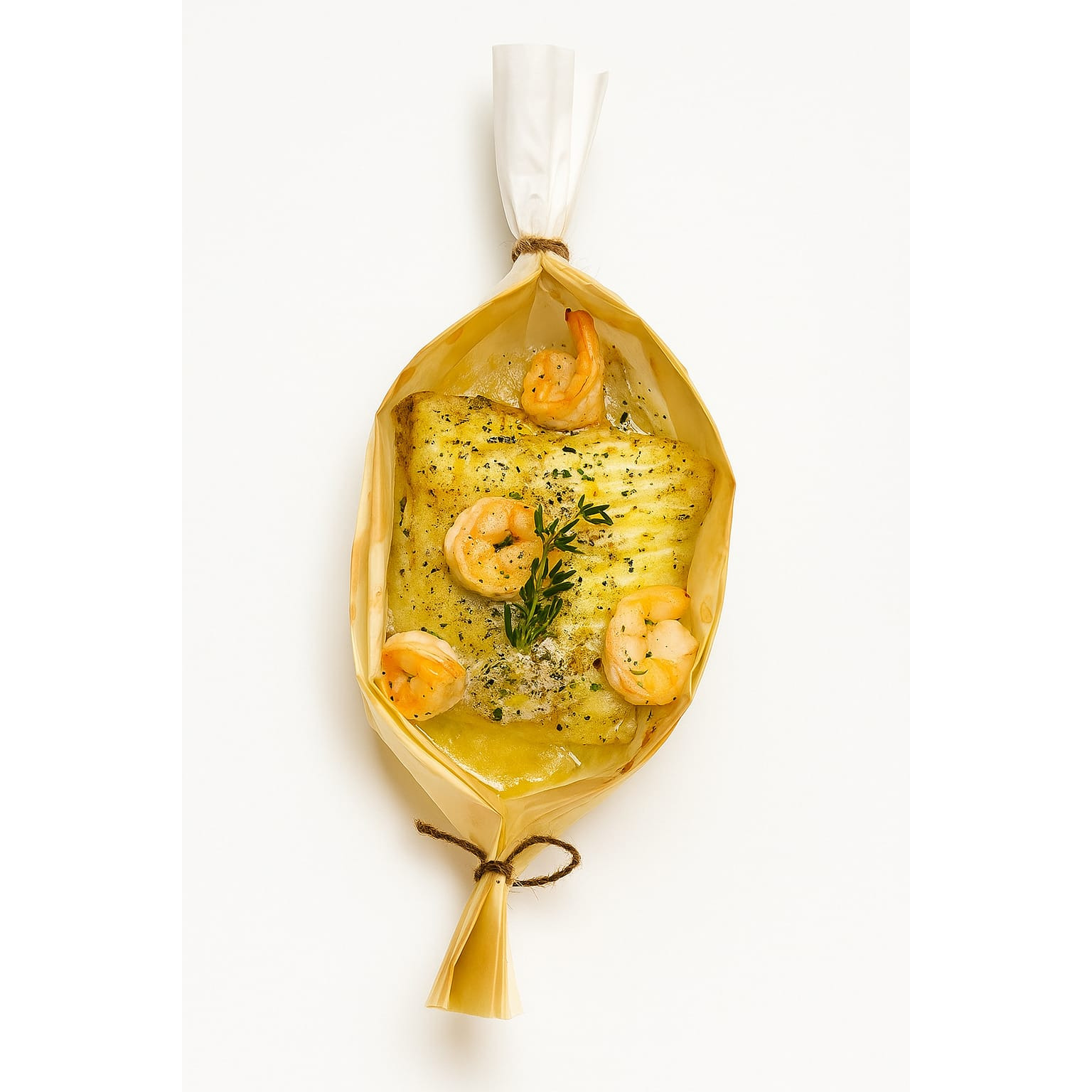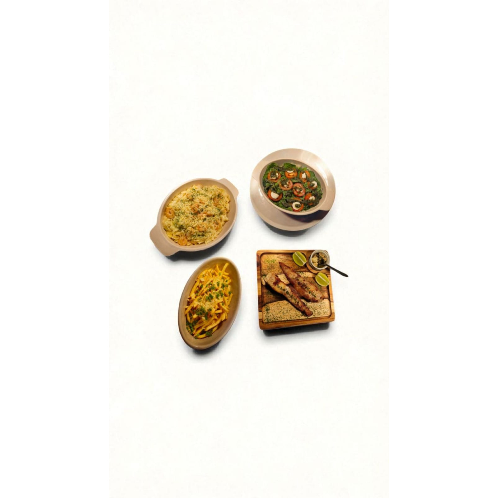 Peixe congrio (2 postas de aprox. 360g total), macarrão fettuccine ao molho de camarão, manteiga e tomilho (aprox. 700g) (a massa pode ser substituída por arroz) e salada.
